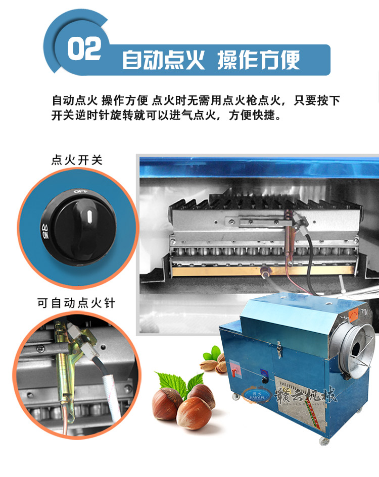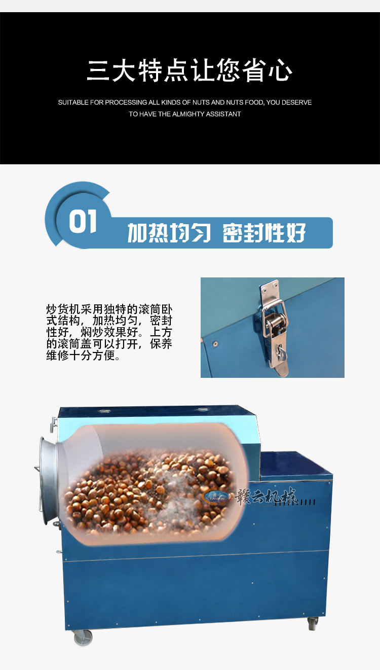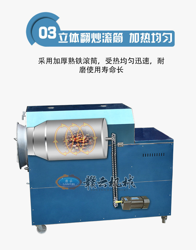 炒貨出入鍋十分方便,只需按動正反轉開關,電機既帶動滾筒反轉,炒貨和小石子會一同出鍋,自動分離,迅速快捷,省事不費力,干凈又衛(wèi)生。是一種值得廣大中小投資者關注的好設備,適合于炒貨廠、商場、菜市場、超市居民區(qū)農(nóng)村集市等固定經(jīng)營,也可流動現(xiàn)炒。