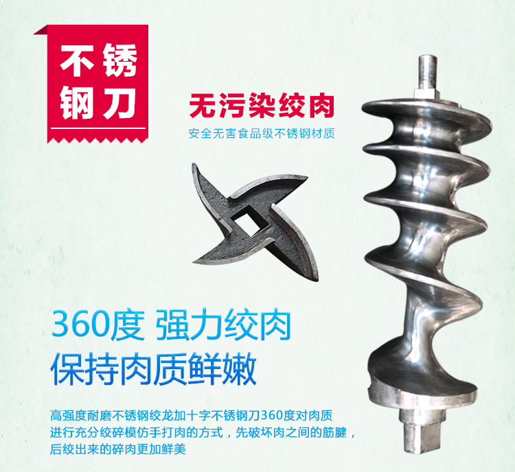 這款32B型強力絞肉機采用不銹鋼材質(zhì)加工精致而成,改傳統(tǒng)的鑄鐵絞肉機頭為不銹鋼絞肉機頭,使之接觸食品部位均為不銹鋼材質(zhì),不生銹,達到食品安全衛(wèi)生要求。