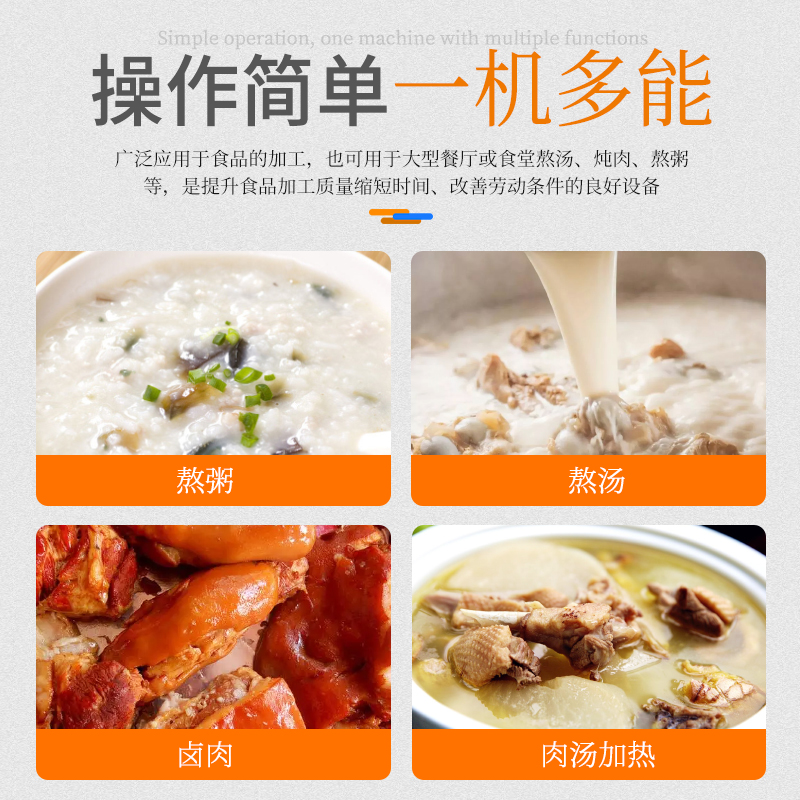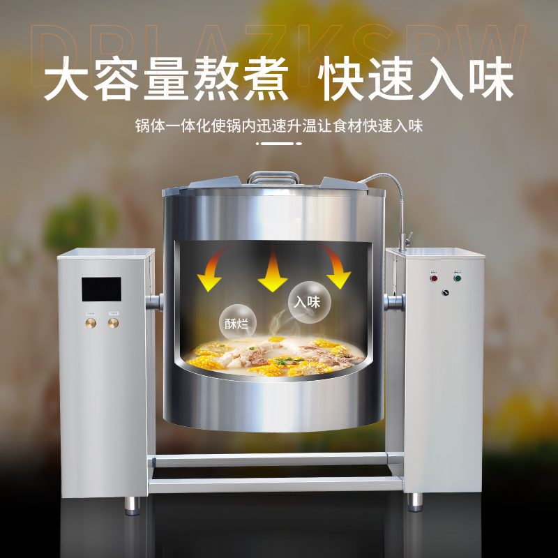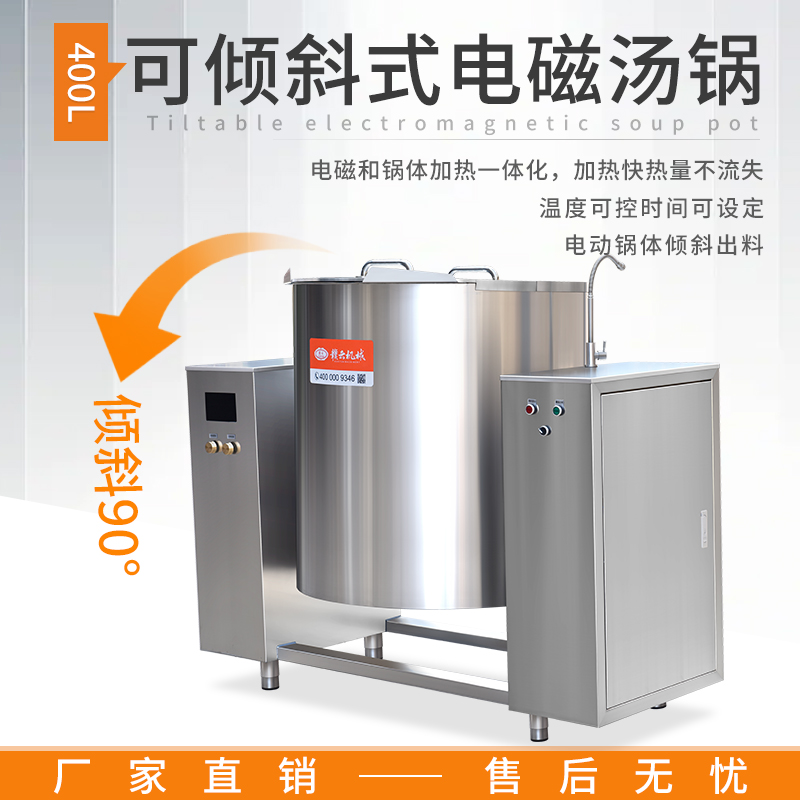 大容量可傾斜式電磁湯鍋,使用不銹鋼材質(zhì),鍋體多重聚能環(huán)使鍋體受熱均勻,熱能快速轉(zhuǎn)化并且受熱后不易冷卻,湯鍋采用可搖擺設計,方便清洗和出料,并且擁有400L大容量設計,每一次熬湯、熬粥、鹵肉、食品加熱更大量,此款商用湯鍋廣泛用于中央廚房,預制菜加工、酒店、食堂等場所
