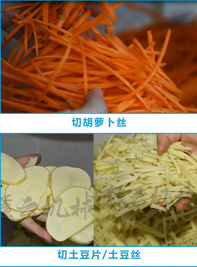 這臺切絲機的一臺多功能的切絲機切片機,土豆、胡蘿卜、茄子、苦瓜、西紅柿等等果蔬類都是使用,全不銹鋼材質(zhì),不易生銹、不易變形、全是水洗、而且大功率每小時500-800KG產(chǎn)量,一臺機器可頂七八個人工。