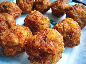 8、 大火油熱后,復(fù)炸一次,盛焦黃色。(油炸肉丸即制作完成)