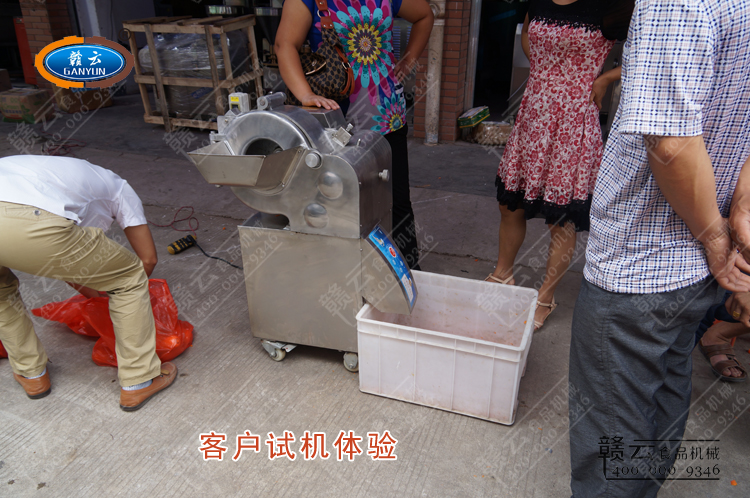 贛云牌130型果蔬切丁機(jī)迎來客戶新體驗(yàn),贛南地區(qū)某商戶加工土豆、胡蘿卜、香芋等,尋求能切15mm丁,5mm絲的機(jī)械設(shè)備,贛云工作人員為其推薦了130型果蔬專用切丁機(jī),切丁刀組完全安裝,切出來就是丁,跟換切絲刀組就能切不同規(guī)格的絲了,試機(jī)效果良好,符合客戶加工需求。