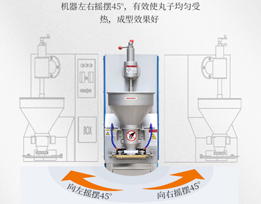 搖擺成型:搖擺肉丸機(jī)通過合理布局,將設(shè)備上半部分設(shè)計(jì)通過齒輪軸承傳動(dòng)可以進(jìn)行左右各45°的自動(dòng)轉(zhuǎn)動(dòng),在邊轉(zhuǎn)動(dòng),同時(shí)邊快速成型肉丸,這樣讓成型后的肉丸下落位置不同,大大減少了肉丸堆積粘連一起的現(xiàn)象。