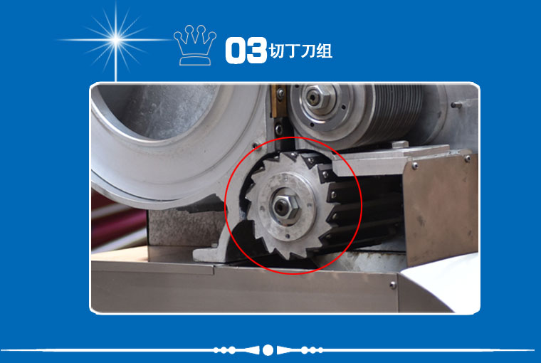 工作原理:GY-DQ-130型切丁機通過旋轉(zhuǎn)撥盤將被切物體帶動高速旋轉(zhuǎn),利用物體的離心力,立刀將物體切成片狀,然后經(jīng)過圓盤切絲刀片豎切成條狀,并將條狀物送入橫切斷刀口,由橫切斷刀盤切刀切成所需的長方體或立方體。